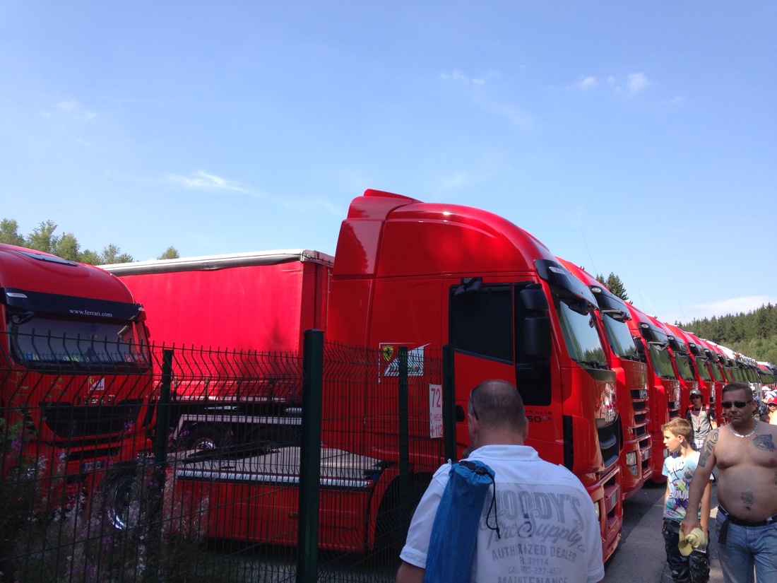We were meeting a father and son from Melbourne, Brian and Nicholas Xerri, who were over for this and the Italian GP, but due to the crowd and area the track covers, we would do that after racing. Once inside the circuit, we had another trek to find a viewing spot. Another 2km walk. This GP stuff is great exercise. On the way we passed the area where all the F1 prime movers were parked. I counted 41 Ferrari trucks alone. Logistics is unbelievable.