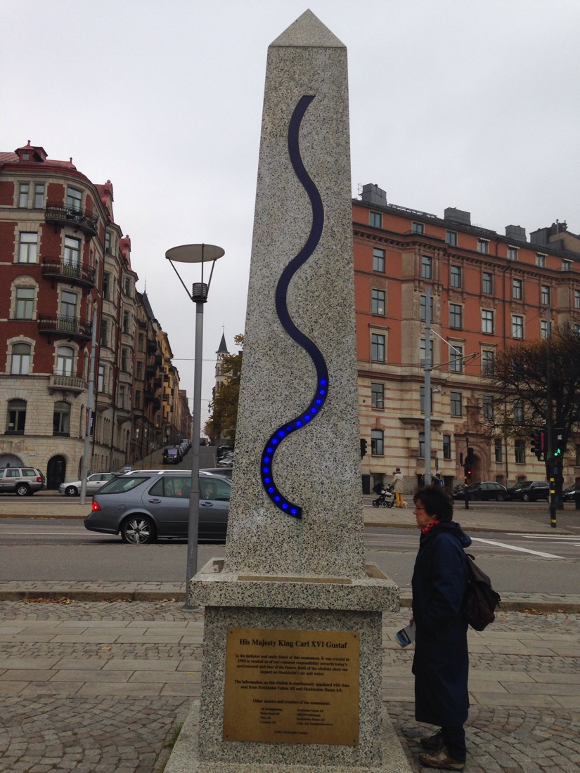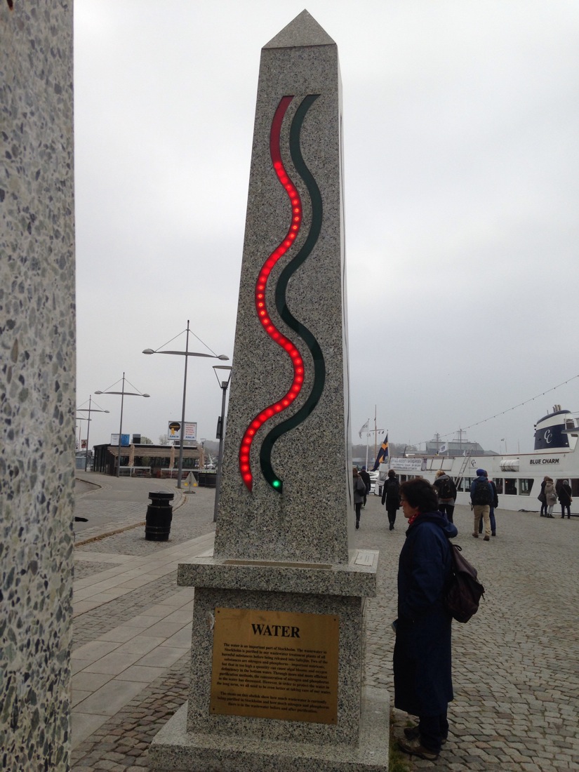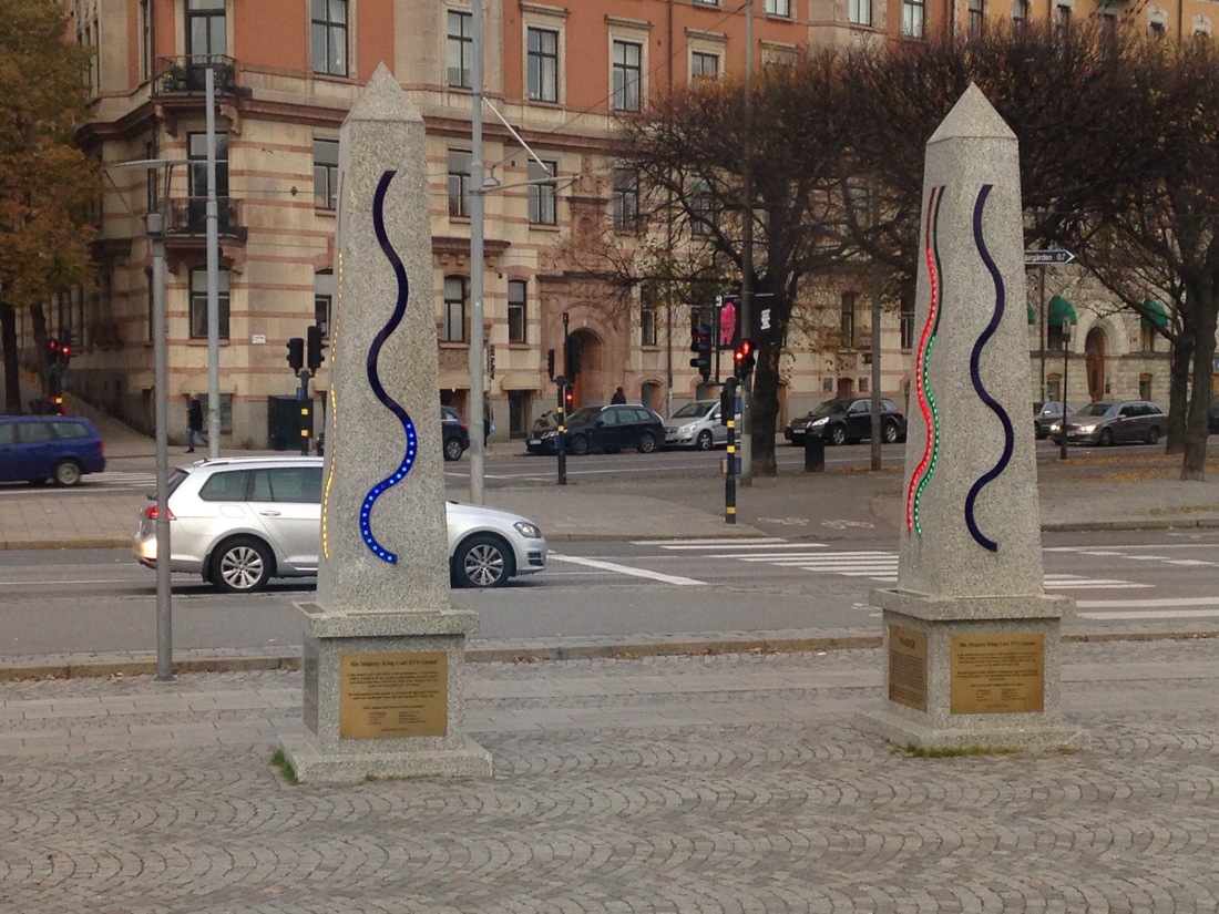 Hear obelisks are quite clever. One measures air quality, wind speed and firection and the other water quality, amount of water in dams, how much is being consumed and hiwmuch is being recycled back into the system. The lights are graduated against a scale.