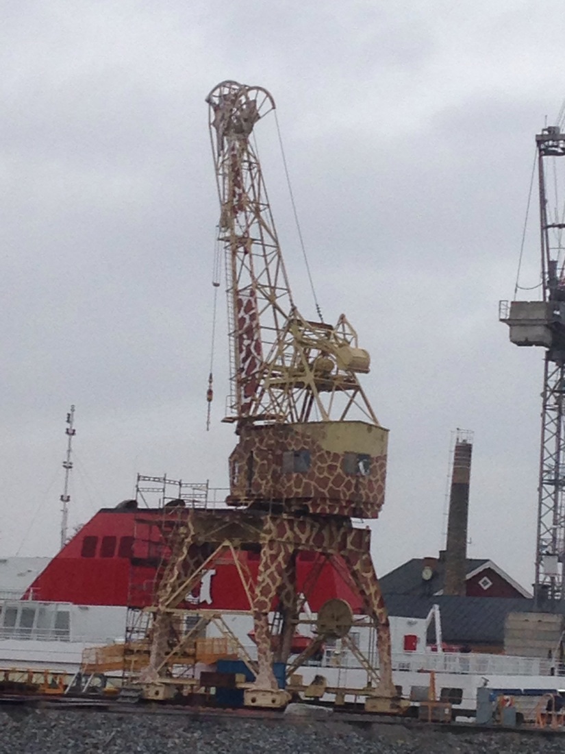 Crane in the harbour painted to resemble a giraffe.