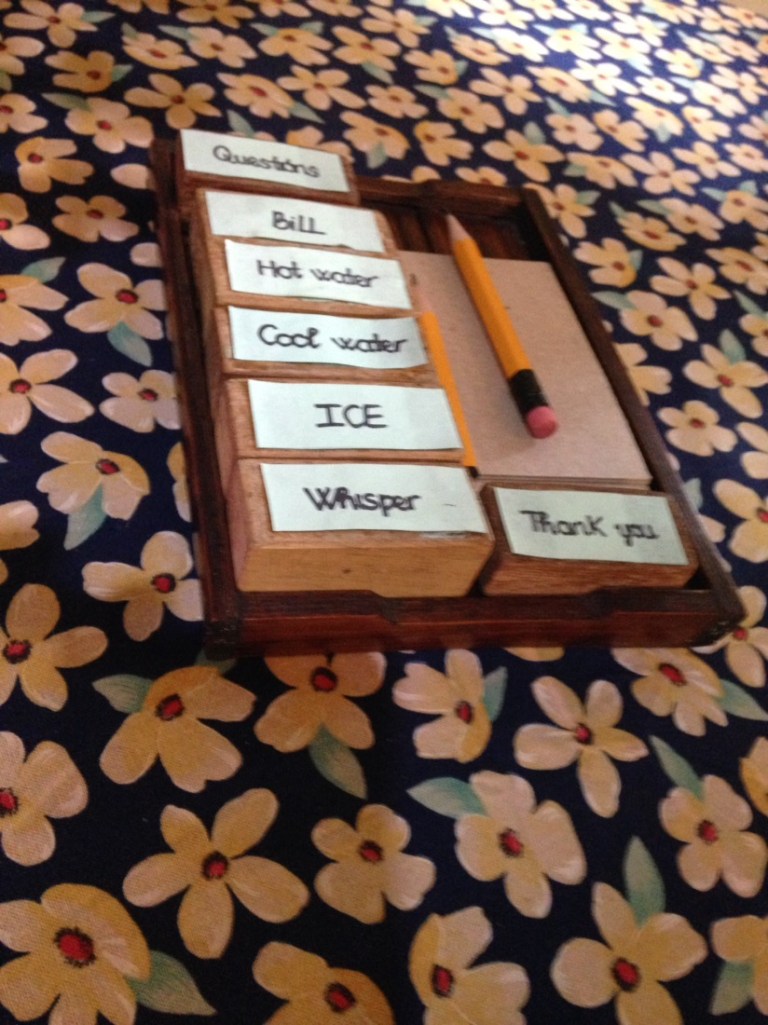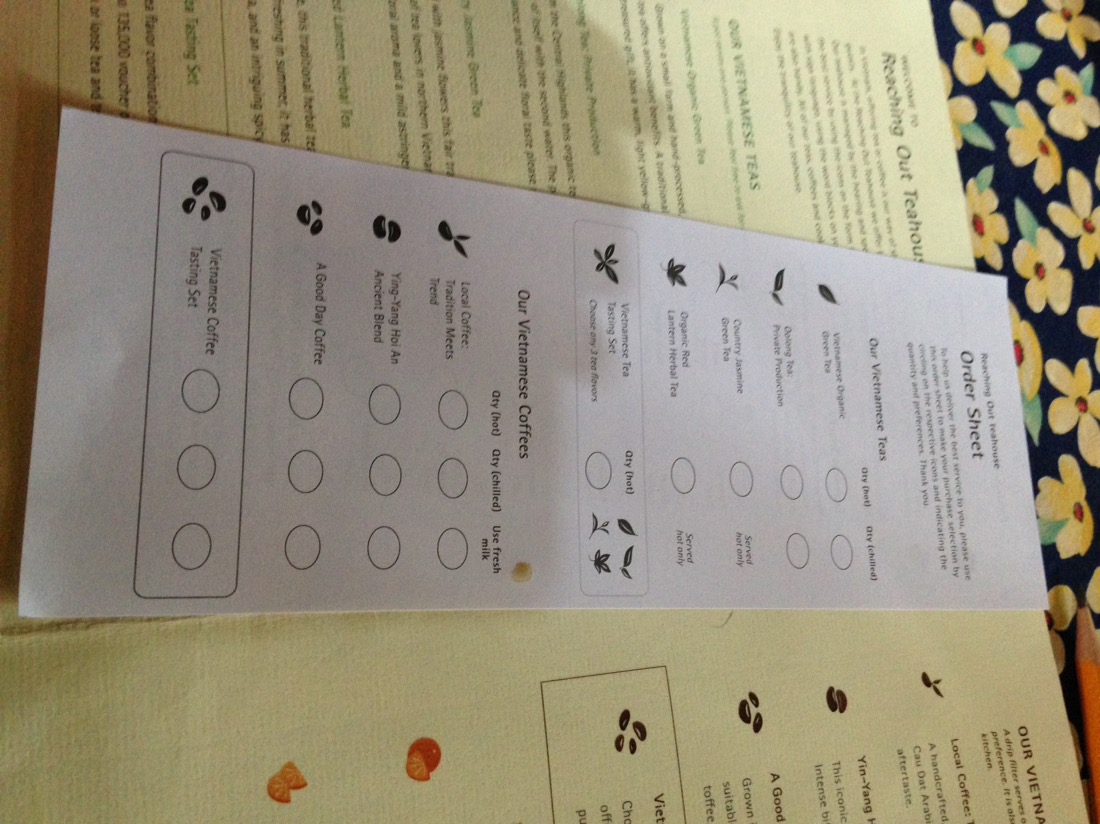All the staff in the restaurant are either deaf or dumb or both. Communication is by the order sheets and wooden blocks in the photos. Talking is discouraged, and the quiet is impressive.