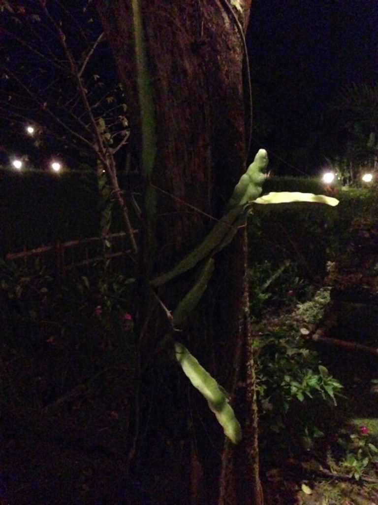Star fruit growing on the side of a tree.
