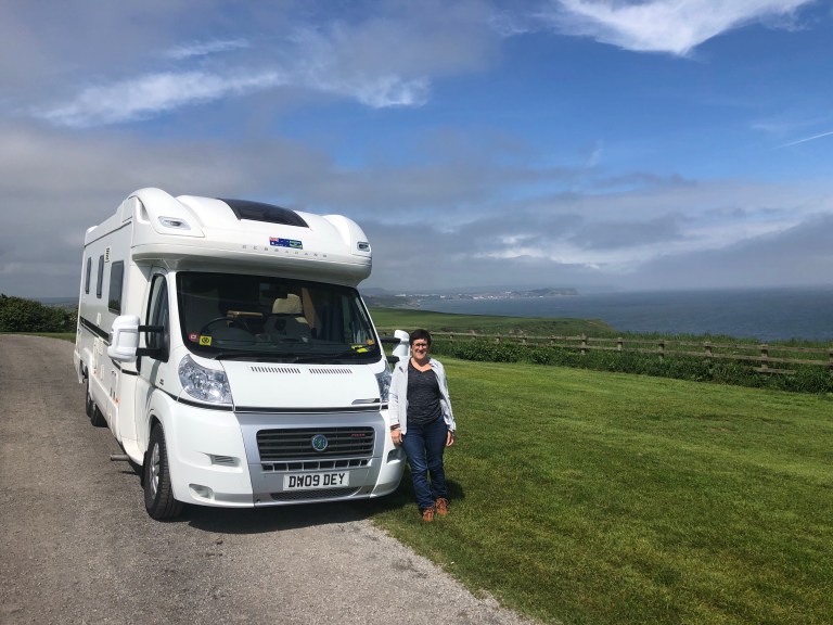 Su and Bess at the camp ground, with Scarborough in the background across the bay.