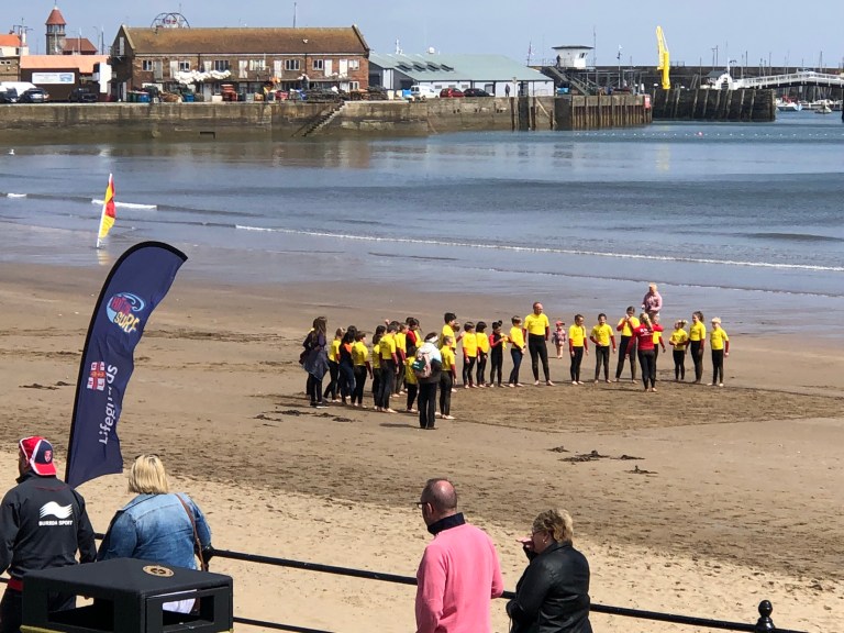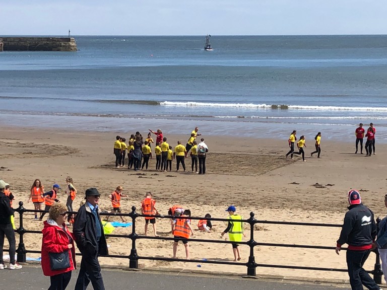 Lots of school children on the beach.