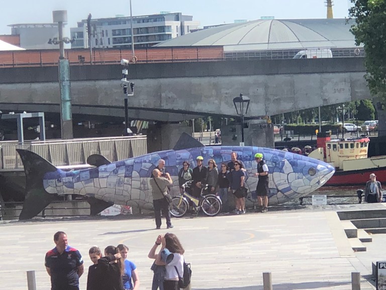 Large ceramic salmon, depicting the return of salmon to the river after 120 years absence.