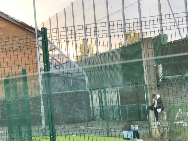 Even though there is a 10 metre wall, notice the back of the house has a protective structure over it. This structure is over 100 metres long and it is to stop the Catholics on the other side of the fence from throwing objects into the Protestant back yards. If you were to go to the area where the Catholics houses backed onto the wall you will see the same thing.
